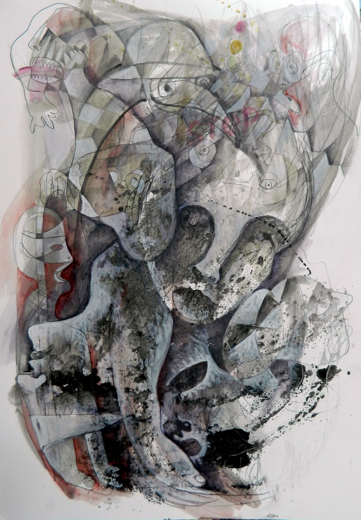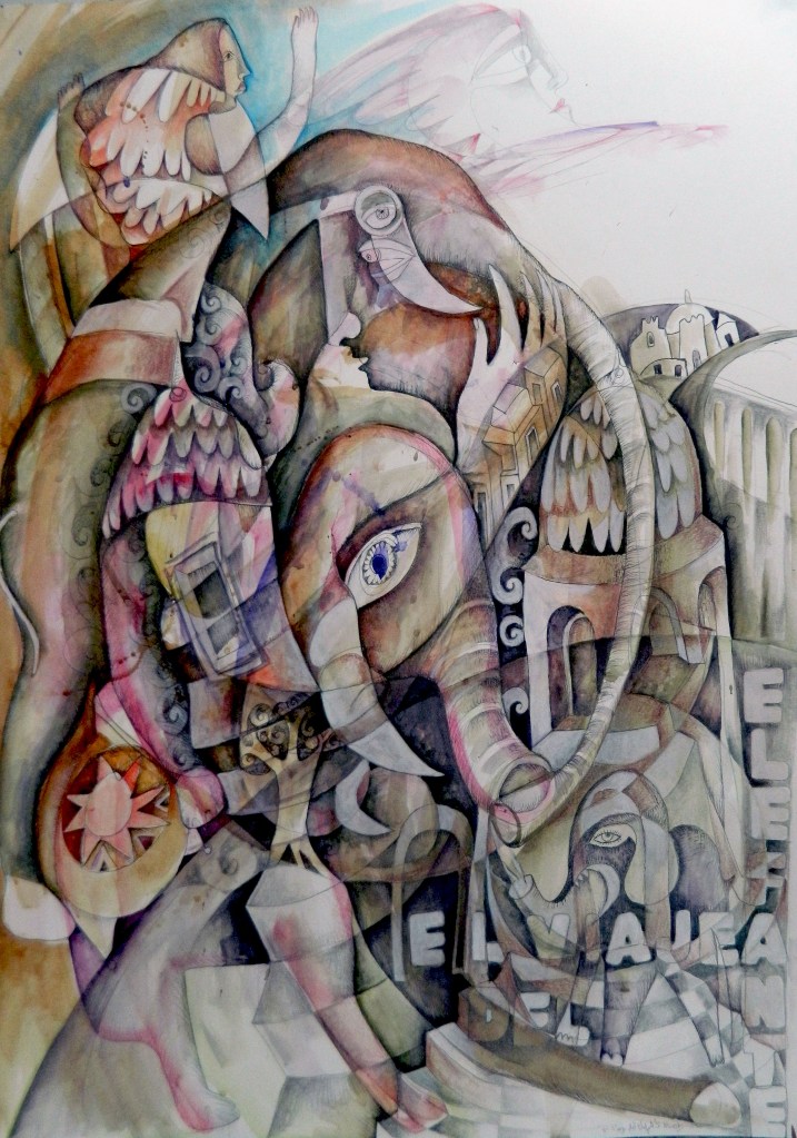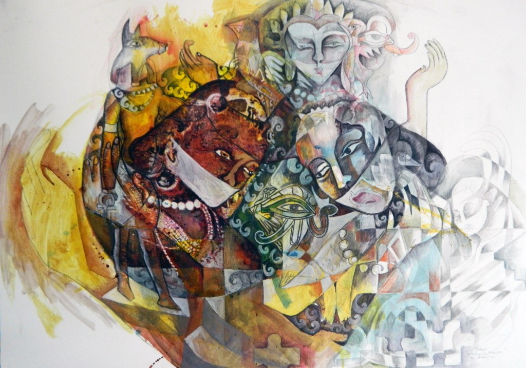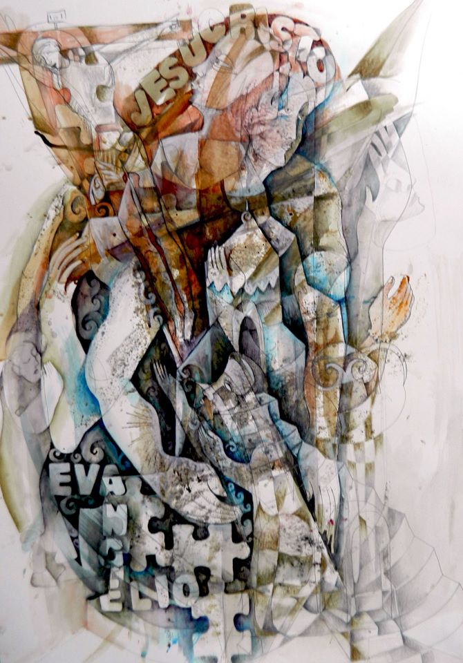 Saramago se interesa por la conciencia del ser humano, buscando los por qué y los cómo de su actuación. ‘Ensayo sobre la Ceguera’ es un libro en el que realiza un auténtico análisis de la sin razón, de la evidencia del ser humano que viendo no ve. Se trata de una ceguera blanca, no negra, porque no se apaga la luz y todo está a oscuras, sino que es la propia visión sin objetivos ni profundidad lo que convierten al ser humano en un ser sin conciencia porque no ve más allá de sus objetivos egoístas. Y con egoísmo no hay bondad. Y sin bondad no hay amor. Y es el amor el que transforma el mundo. Felipe plasma esta rotundidad de visión teniendo en cuenta también la reflexión del Nobel portugués sobre la esencia de la identidad en la novela ‘El hombre duplicado’. Hay obras de Felipe de esta serie como la titulada ‘Ruptura celestial’ donde humaniza a los dioses y profetas hinduistas, budistas, jainistas, buscando aspectos y comportamientos humanos en los mismos. En este sentido coincide con el escritor luso en que lo más importante de la existencia es el ser humano y que como tal está sujeto a fallos, falta de visión, necesidad de ver más allá de las limitaciones cotidianas. Por eso la serie de dibujos y pinturas de Felipe Alarcón es especial, en el sentido de que se centran en el humanismo, en la necesidad de ir más allá.