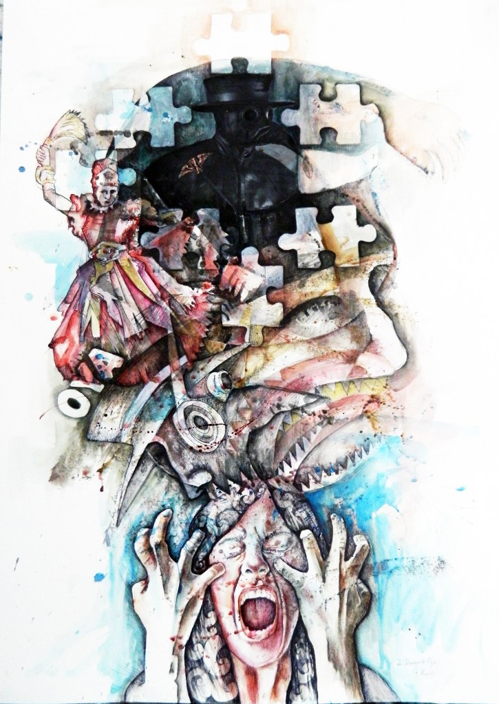 Felipe trabaja la serie en técnica mixta sobre papel, cartulina, lienzo y tela, predominando el dibujo, también el color, la expresividad y la alegoría se combinan en el desarrollo pictórico, en el que hay una clara base de dibujo, con presencia de difuminados, transparencias, collages, seleccionando mucho el punto de enfoque. Dos pandemias, dos realidades, dos enfoques, dos finales… Bueno todavía no sabemos cómo se desarrollará el final de la covid 19.
