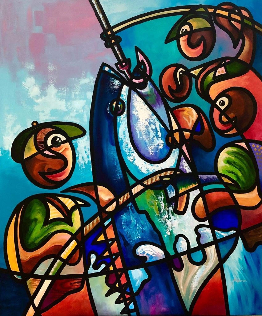 AVAILABLE | “IN FISHING FOR TUNA” | Acrylic on canvas, 100×120 cm | Cape Verdean artist, T. Sousa | contact us nimbartgallery.com