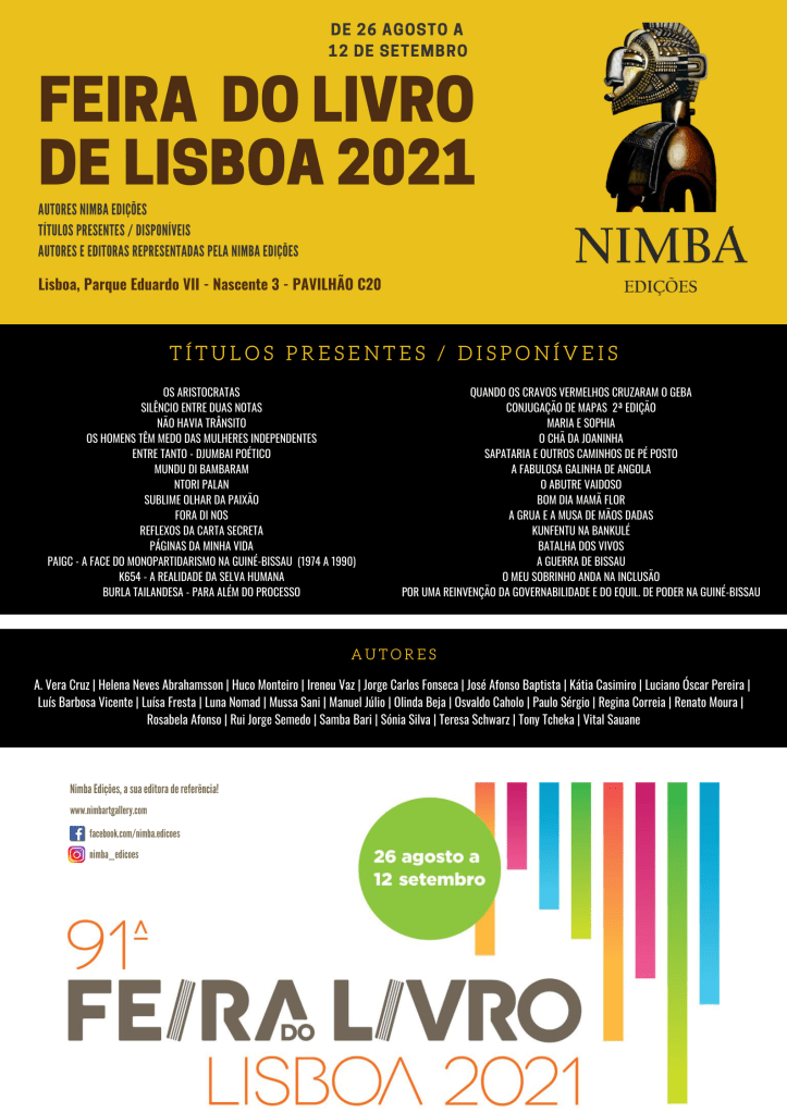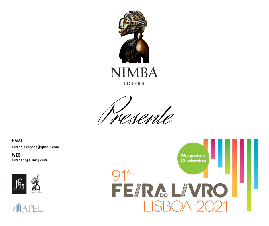 NIMBA EDIÇÕES estará presente na 91ª FEIRA DO LIVRO DE LISBOA 2021 que se realizará de 26 de agosto a 12 de setembro. Convida a todos os autores e editores, com títulos já publicados, que queiram estar presentes no pavilhão da Nimba Edições que entrem em contacto através de nimbartgallery.com | Subscreva a nossa página e acompanha as novidades de literatura, arte e cultura da lusofonia, palop, africana e sul americana.